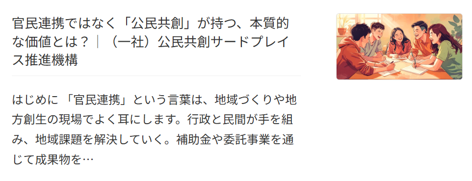 今回の記事では、「官民連携ではなく『公民共創』が持つ、本質的な価値とは?」をテーマに、「官民連携」と「公民共創」の違いを整理しながら、“人を起点にする共創”が地域にもたらす本質的な価値を考察しています。